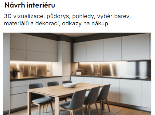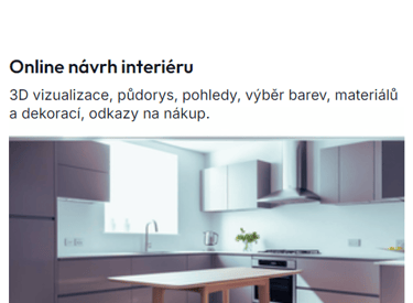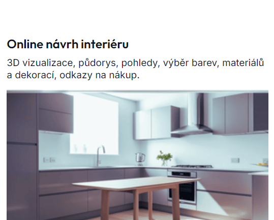 V případě velké vzdálenosti nebo nedostatku času rovněž online objednávky a poradenství - Nemusíte nikam chodit. Celý proces návrhu a konzultace lze realizovat online. Z pohodlí vašeho domova si můžete objednat designérské služby, konzultace či 3D návrhy. Rychle a pohodlně, bez nutnosti osobních schůzek.